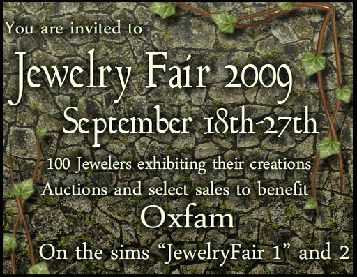 Features: *over 130 Jeweler’s creations *Dunk Tank – dunk a Jeweler (or a Linden!) for charity *Kissing booth – kiss a Jeweler for charity *one of a kind auctions – bid on original jewelry pieces never to be owned by anyone else on the grid *jeweler resources area – how to make your own jewelry! *demonstrations and classes on jewelry making (schedule handed out at the fair)