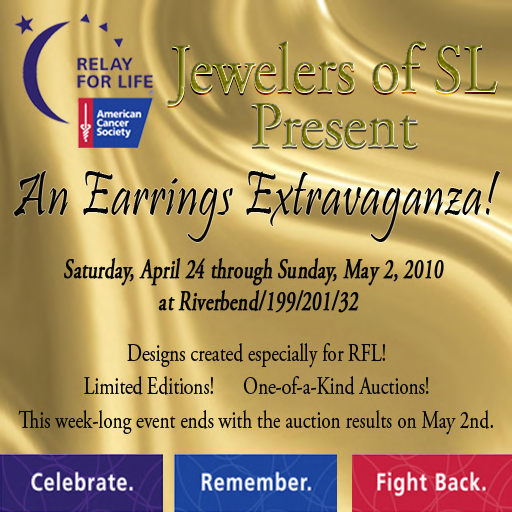 Saturday, May 1 – Sunday May 2: Set up our RFL Jewelers of SL Team vendors at the RelayPalooza 2010 hosted by Buckaroo Mu. Live entertainment.