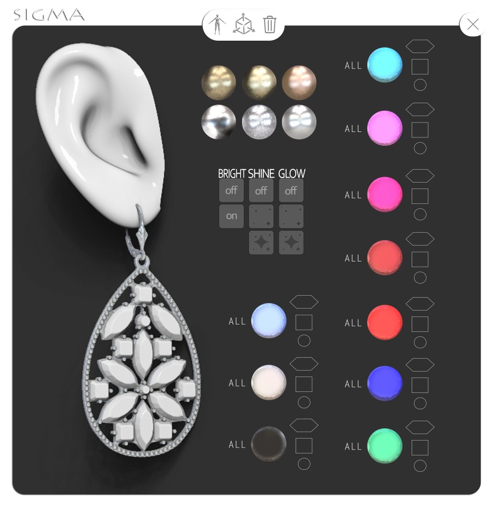 Drop earrings with faceted stones, unskinned mesh, HUD controlled (many metal and stone shades oprions), resizable, copy.