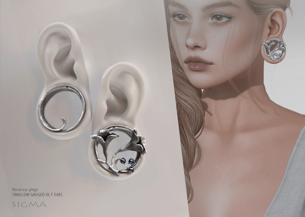 Intricate sculpt flowers for these ear plugs. Several metal and stone shades plus tinting ability. Copy and Mod. Skinned for Swallow Gauged XL female ears.