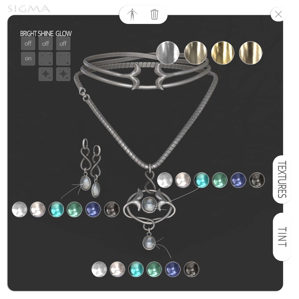 Art nouveau styled pendant, choker and matching earrings. Several metal and stone shades plus tinting option. Copy and Mod.