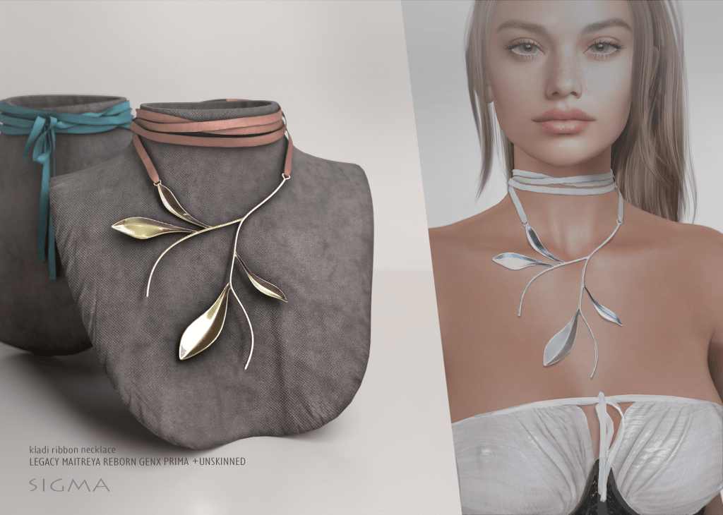 Nature never ceases to inspire. A stylized olive tree twig and long ribbons around the neck. Original mesh, several ribbon and metal shades in the HUD. Copy and mod.