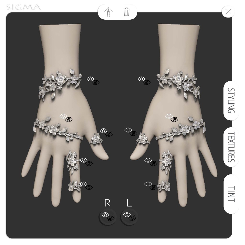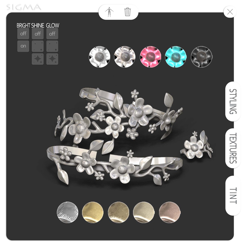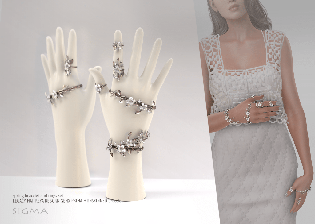 Set of floral bracelet, hand bracelet and rings. Copy and mod. HUD with many metal and flower shades, tint and style options.