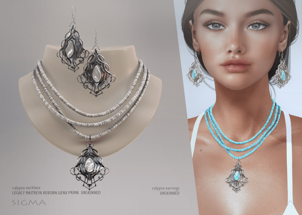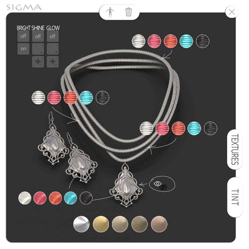 Necklace with ornate pendant and matching earrings. Copy and mod. Many shades in the HUD plus tint.