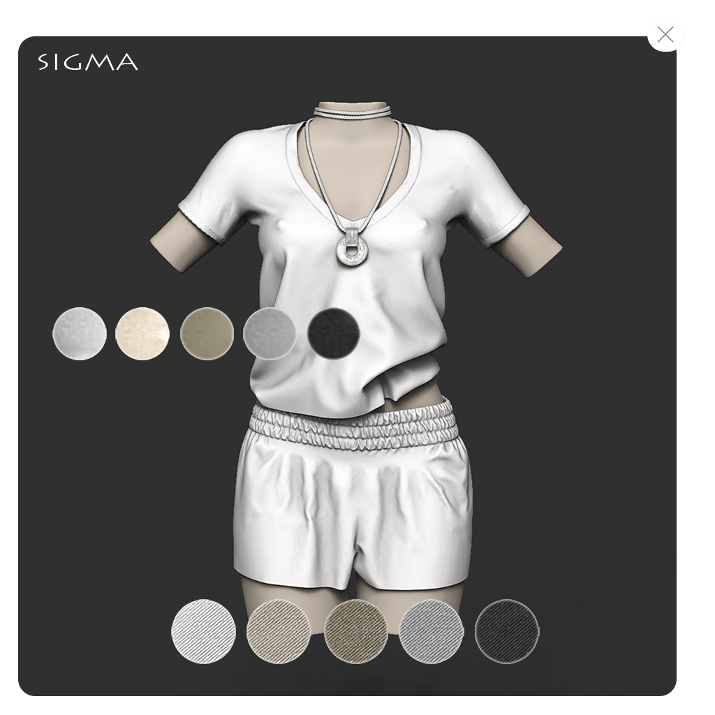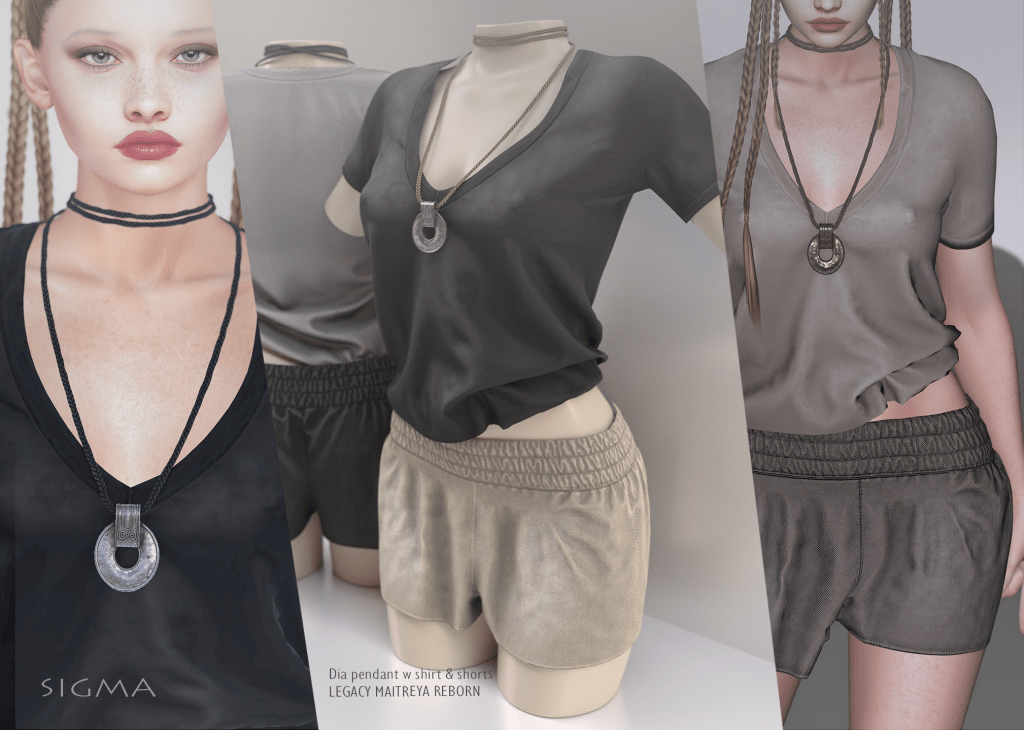 Classic V neck Tshirt, elastic waist shorts, and a long cord metal pendant on top.
