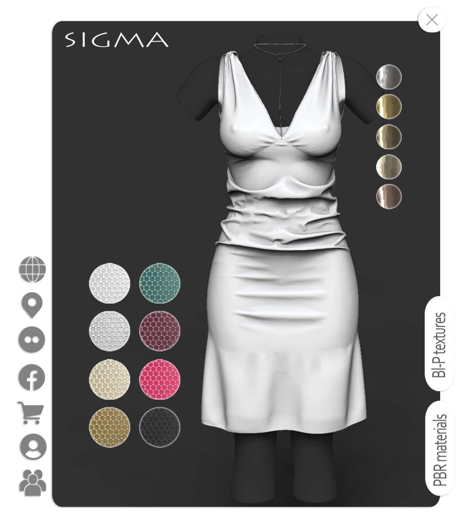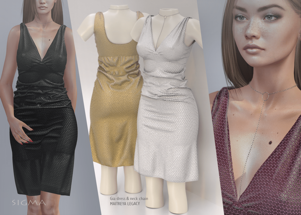 A mid length dress with a delicate neck chain. Copy/mod. Several shades (pbr & bp) in the HUD.